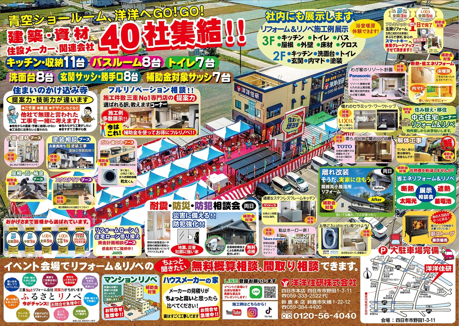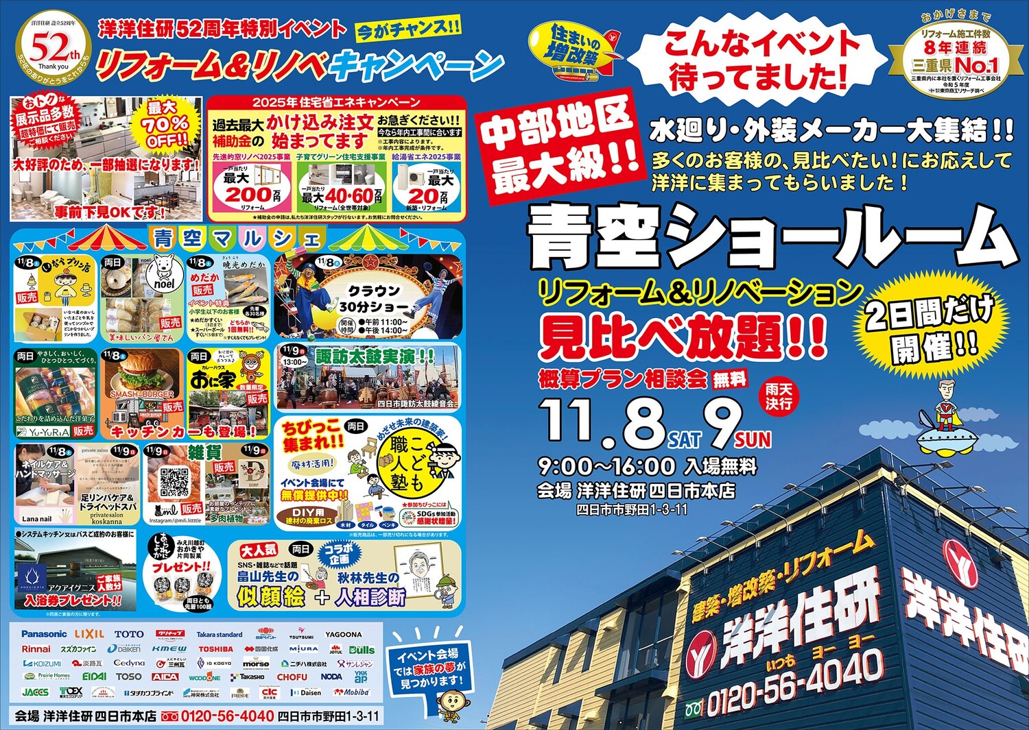 リフォーム&リノベーション見比べ放題!多くのお客様の見比べたいにお応えして、水廻り・外装メーカーが大集結!「中部地区最大級!青空ショーム」11/8・9の2日間、洋洋住研四日市本店にて開催!