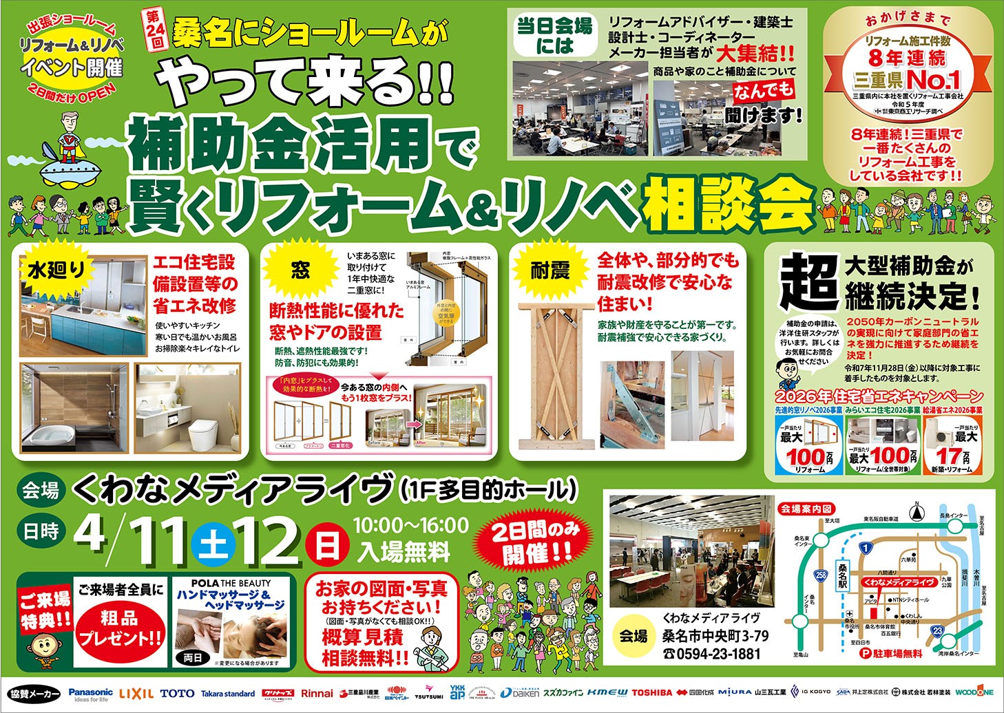 補助金活用で賢くリフォーム&リノベ相談会「第24回 桑名にショールームがやって来る!」4/11・12の2日間、くわなメディアライヴ(桑名市中央町)1F多目的ホールにて開催!